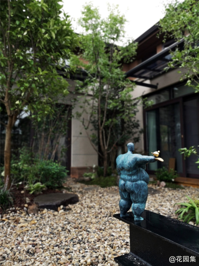 业主品味不凡,欣赏现代艺术,亲自挑选的雕塑小品为庭院加入了强烈的个人色差