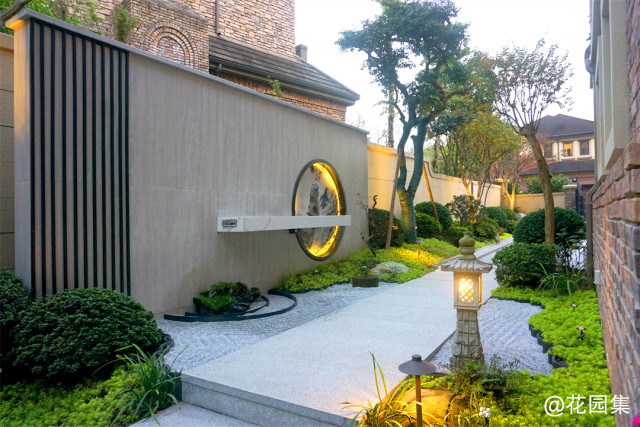 入户处简洁的大面积石材铺装,因为没有地下车库,所以留出了足够的空间,方便停车;入户右侧设计了一块日式造景区,白砂勾勒出枯山水的意向,以及颇显禅意的景墙。