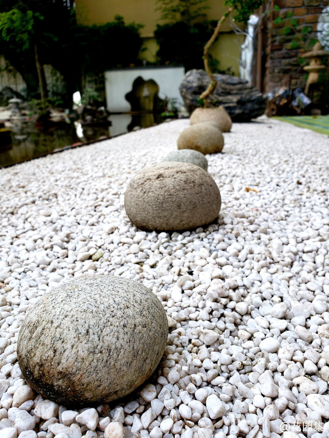 水池的周围,设计了蜿蜒的汀步,一直通向白砂、黑松、石组铺就的枯山水庭院,边上依旧是竹篱围合,白砂之中,3棵原生的香樟树挺拔葱郁,数十块大小不一,酷似水墨画的雪浪石错落成群,除了3棵枝形优美的黑松,全是洁净的白砂,依照地形的高差形成自然起伏的缓坡,靠竹篱的那一侧,一些来自金沙江和嘉陵江边被河流经年打磨过的鹅卵石,铺成一天蜿蜒的枯溪,远远看去,意境深远,好像溪涧的水才刚刚从这些石头上退去。也许是因为女主人从小在嘉陵江边长大,所以她对这枯溪和这些来自江边的石头尤感亲切。