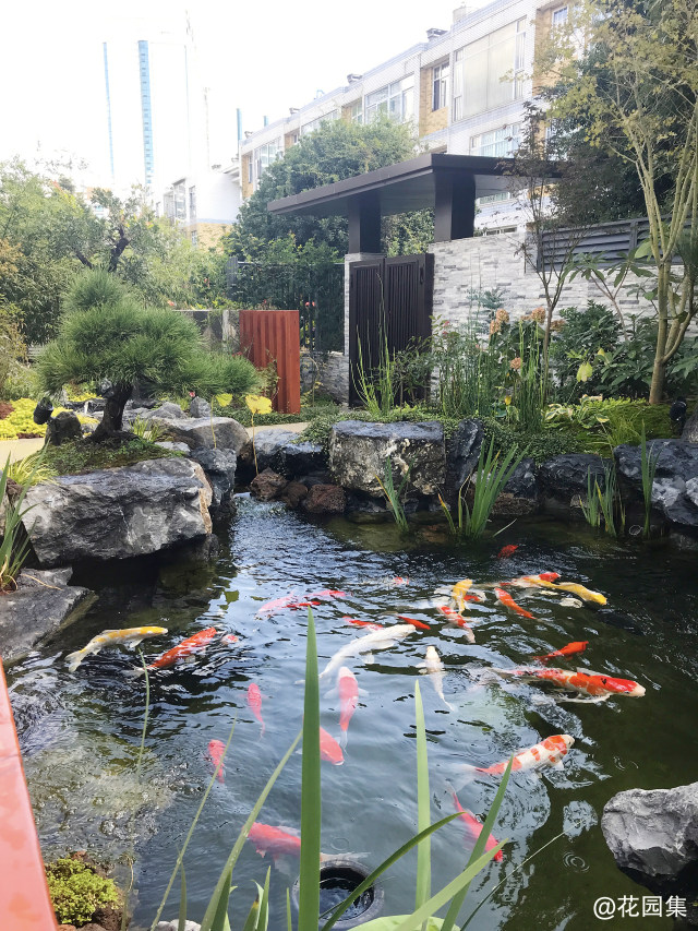 强烈的色彩反差在花园里特别显眼,驳岸黑山石的深黑与水中锦鲤的艳丽也是鲜明的对比