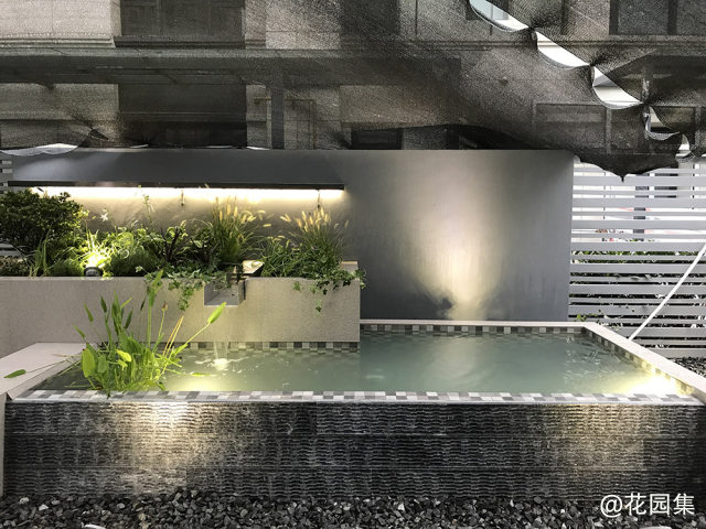 规则的现代鱼池,一侧外池壁,设计了一面叠水景墙,溢水流过叠水板,下渗到碎石下的循环蓄水池。波光粼粼的水幕墙,增加了我们整个鱼池景观丰富性。