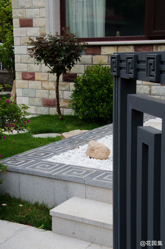花园中的回形纹、自然景观石、用旧的磨盘石和拴马桩等中式元素,与简洁明快的现代线条元素,都以框景、障景等中国古典园林的景观形式从始至终贯穿整体。
