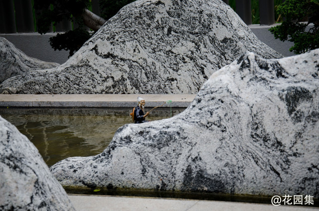 摒弃水景墙的常规做法,用中国传统园林元素与现代景观结合的方式,把雪浪石片石、砂砾、静水面相融合,吸取自然界中山川河流婆娑倩影的形态元素,浓缩在花园一角。