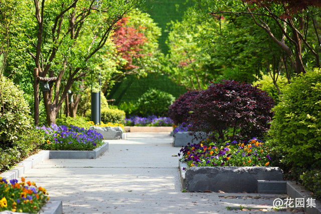 多彩的角堇、红花继木球、海桐灌木球、石榴、红枫等多种植配,结构起了色相丰富、错落有致的观赏空间,从视觉上形成了曲径通幽处的效果,令人欲举步前往一探究竟。