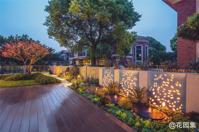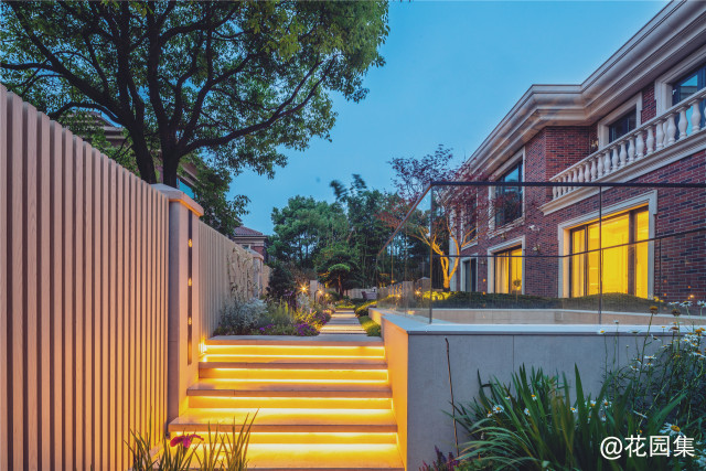 不同的路,采用了不一样的方式表现,有町步,也有对准的石板路,旁边是专业的花境设计师搭配的植物,让业主可以在不同的季节都意识到春意。下晚的时候,打开灯光,整个花园的气氛都会被烘托出来,每个地方,都设计了不同的光线,照射出一个温暖浪漫的环境。