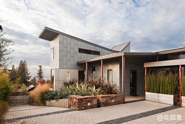 在这片梦幻般的草地上,圆形和丘状的植物不断出现和重复——这是一种有节奏的种植方案,极具诱惑力,令人难忘。银色和绿色的桑托利纳覆盖着地面,而紫色的葱在较高的茎上重复着这种球形。远处深紫色薰衣草的魔杖回荡着葱,增加了深度。