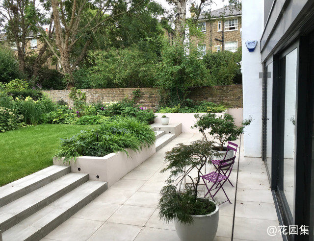 靠着后墙生长的小树是梨、苹果和樱桃,用固定在砖块上的电线训练。“业主真的很想要果树,”伯恩斯坦说。“因为它是一个朝北的花园,后墙的阳光最多,所以我们利用墙的热量来帮助树木。”