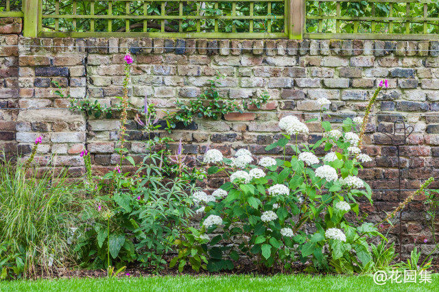 在绣球花的后面,常青的星茉莉(Trachelospermum jasminoides)爬上了古老的砖墙。在这张床上,还有更多以毛地黄和尖尖的veronicastrum(Veronicastrum sp.)形式存在的令人愉悦的花朵。果园还种植了新西兰风草 ( Anemanthele Lessoniana ),一种观赏草,如图所示。