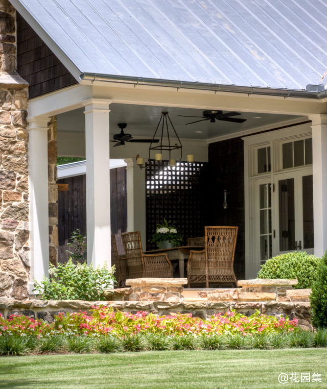 深餐厅门廊是现在环绕着这个家的几个户外生活空间之一。一个由当地石头制成的壁炉和一张原始的农舍餐桌,为农场提供了一个合适的用餐环境。