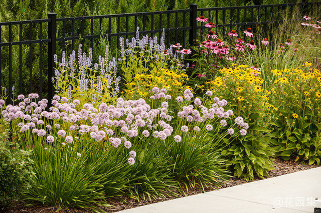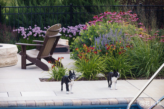 火坑周围的植物包括'Goldsturm'黑眼苏珊(Rudbeckia fulgida var. sullivantii'Goldsturm ')、蓝色野靛蓝(Baptisia australis)、'Ruby Star'紫色松果菊(Echinacea purpurea'Ruby Star')、'Pardon Me '黄花菜(萱草' Pardon Me'),'夏日美人'葱属(Allium tanguticum'Summer Beauty')、火地蓍草 ( Achillea `Feuerland')、'Skyracer' 沼地草 ( Molinia caerulea ssp. arundinacea 'Skyracer')、'June' hosta ( Hosta ' June')、' Blue Fortune' 巨型牛膝草 ( Agastache 'Blue Fortune')和'Glow' astilbe ( Astilbe x arendsii 'Glow')。