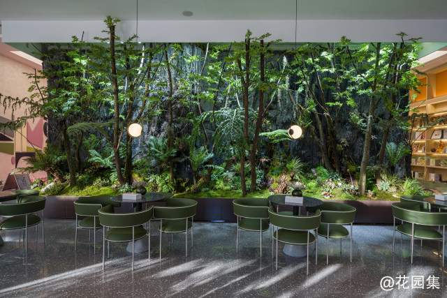 森林景观:整个背景模仿山体岩壁,共6层基底,是团队最花时间的一个造景部分,岩壁脉络精致,肌理细腻,黑灰色系的背景,能更好的衬托森林的绿色前景。枝干粗壮的树木撑起整个空间,“顶天立地”的视觉效果突出原始森林的氛围。底层的山谷、精致的热带丛林、原始的坡地,搭配各类风情的古老蕨类,让整个园林商务洽谈区充满神秘感,又不由自主的想要探寻究竟。