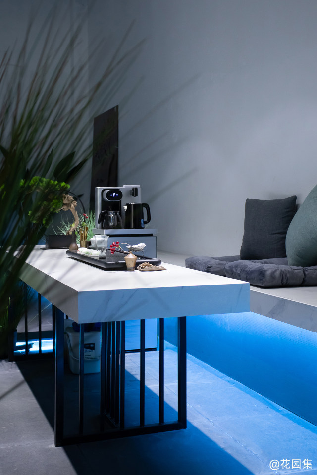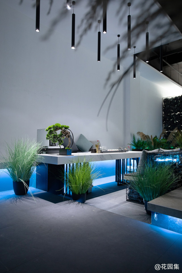 我们以中轴线为基准,把完整的地面破成了几大区域,在区域与区域之间的裂缝我们装上了蓝色的便携式磁铁灯带,在中轴线的两侧我们分别利用植物和石笼景墙在地面破碎下沉的基础上做了半包围空间,让人们更好的,更有安全感的享受当下