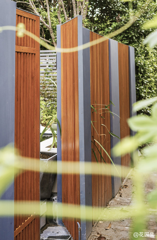 小院西面的邻居喜欢私密,于是就有了墙面和木板相结合的思路。统一中附于变化,简洁中增加趣味。小小的院墙增加了一个小立柱既打破单调,又是放置花园水栓的最佳位置。