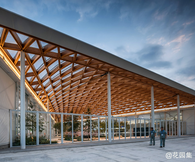 此次庭院项目是为在西岸召开的世界人工智能大会B馆所使用。场地分为东西两个互不相连的三角形中庭空间,拥有跨度极大的木结构穹顶,是在会展期间为参观者提供咖啡休闲和游览休憩的场所。