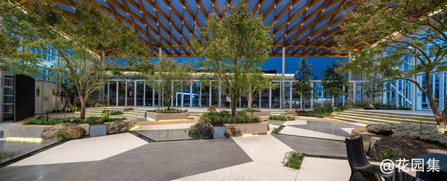 此项目由于是室内空间,开先例用了很多新材料来更好的实现设计诉求,地面的金磨石,花坛的大沽石,并且在植物选择上我们也全部使用了容器苗,来自俄勒冈的河桦,娜塔莉,来自放鹤路苗圃的鸡爪槭,正因为如此,才能够随时都可以种植,并且效果立竿见影。