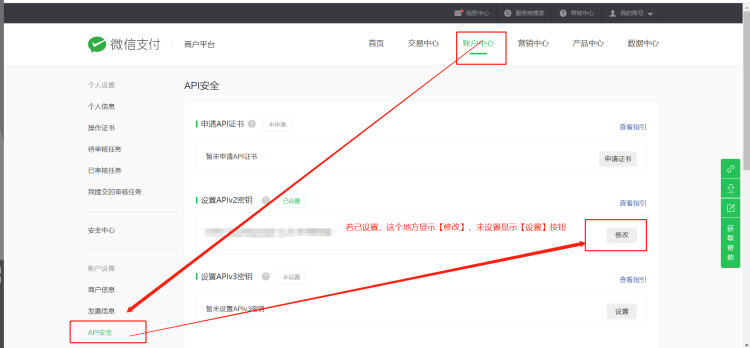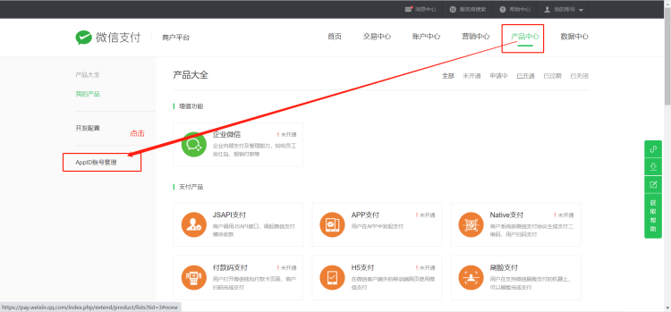 - 登录微信支付商户平台,进入产品中心,点击【开发配置】,获取商户号