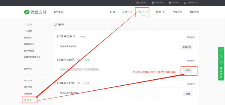 - 进入账户中心,点击【API安全】,APIv2密钥